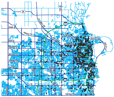 The map depicts violent crime in Omaha, Nebraska, and is one of many maps available in the Omaha Urban Atlas 2002. Violent crime involves the use of force and includes both assaults and robberies. This map depicts these crimes for the year 2000 by location. Robberies occur along the major arterial roads